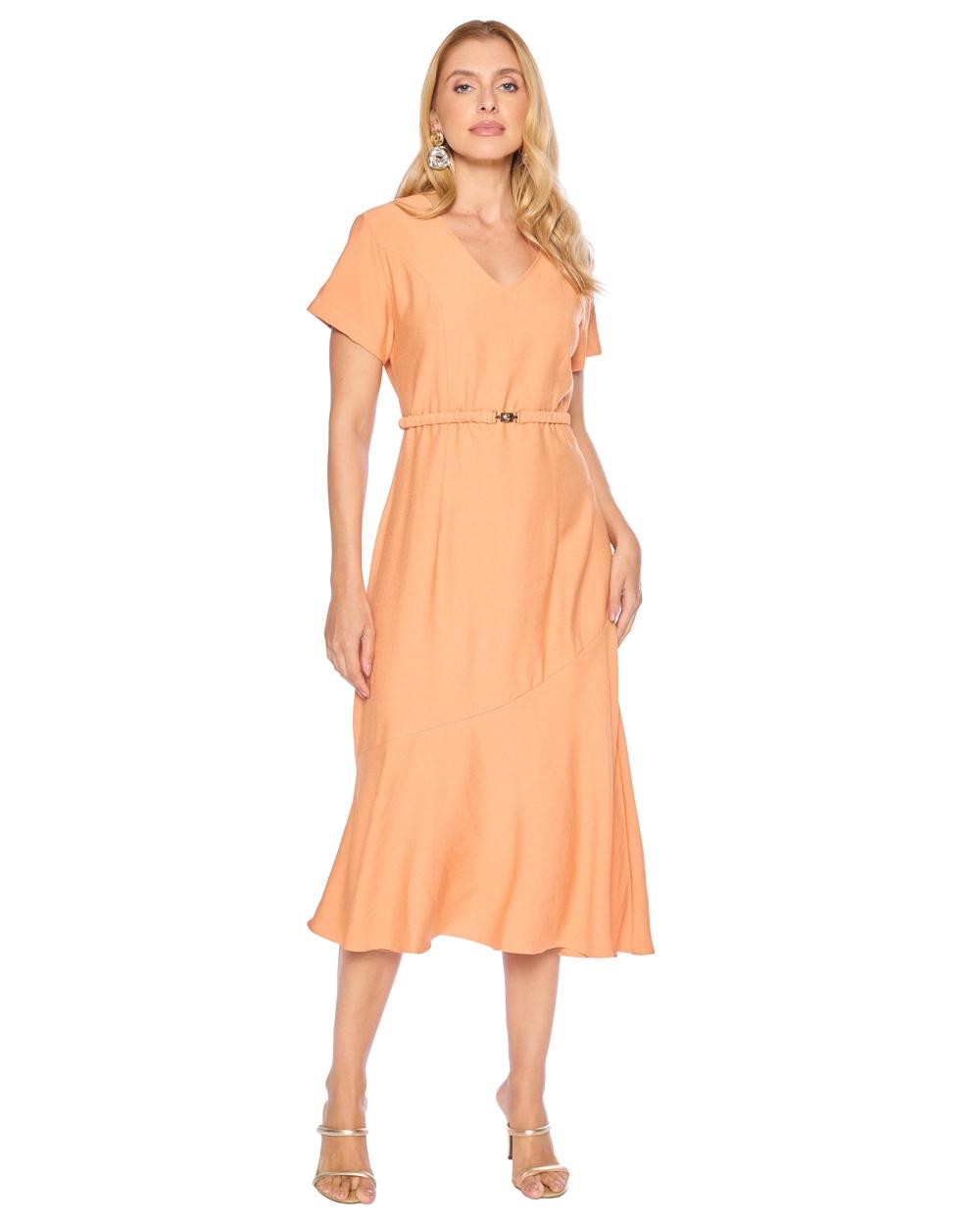 VESTIDO EM CREPE AVILA. CORTE RETO ACOMPANHA CINTO DE ELASTICO COM FIVELA DOURADA.